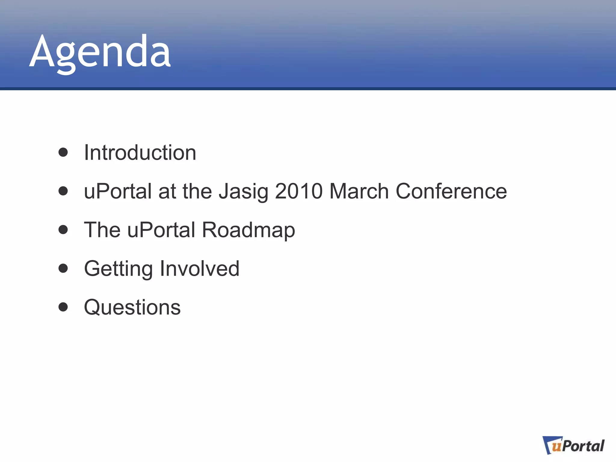 The document outlines the agenda and plans for uPortal roadmap discussions. The agenda includes an introduction to the uPortal steering committee members, information on the upcoming Jasig 2010 conference and uPortal presentations, the uPortal 3.2 and 3.3 roadmaps, and ways for the community to get involved through portlet development, documentation, testing, and sharing their uPortal deployments.