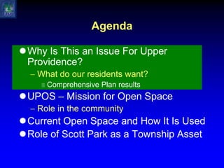 The document discusses the importance of open space to residents of Upper Providence Township. It highlights results from the 2005 Comprehensive Plan survey that show residents value parks and open spaces. Over 60% of residents get their water from Ridley Creek, so maintaining high water quality through open space preservation is important. However, there is development pressure that could threaten environmentally sensitive lands. The Township group UPOS works to preserve open spaces in line with the Comprehensive Plan and sees Scott Park as a valuable educational resource due to its diverse ecosystems.