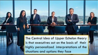 The document summarizes Donald C. Hambrick's Upper Echelon Theory. The theory proposes that executives make decisions and act based on their own personal experiences and interpretations of situations rather than objectively. It also argues that the collective characteristics of a company's top management team are more predictive of organizational outcomes than any individual executive. The theory was refined over time to include the concepts of managerial discretion and behavioral integration of the top management team. Empirical evidence from several studies provided support for aspects of the theory. Challenges remain in fully understanding the cognitive mechanisms by which executive characteristics influence decisions.
