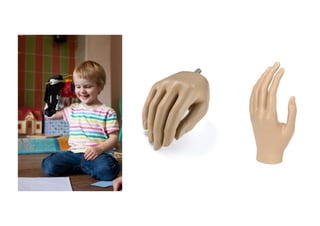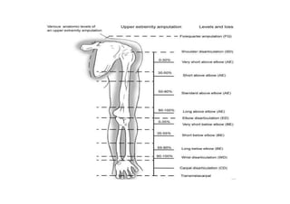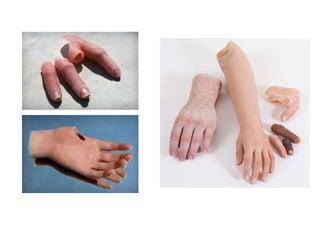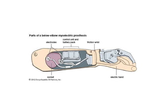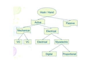 The document discusses upper extremity prostheses. It describes different types of prostheses including passive prostheses for cosmesis, body-powered prostheses that use harness cables, and externally powered electric prostheses. It provides details on terminal devices (hands, hooks), wrist and elbow units, socket designs, and the rehabilitation process. The goals of prosthetic design are comfort, function matched to the user's needs and activities, durability, and cosmesis. Design considerations include the amputation level and residual limb.