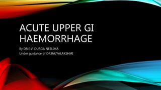 Upper GI bleeding refers to bleeding from the GI tract proximal to the ligament of Trietz. Non-variceal bleeding accounts for 80% of cases, with peptic ulcer disease being the most common cause at 30-40%. Portal hypertensive bleeding from gastroesophageal varices accounts for the remaining 20% of cases. Early endoscopy within 24 hours of bleeding results in reduced transfusions, decreased need for surgery, and shorter hospital stays. Endoscopic therapies like epinephrine injection and thermal coagulation are effective first-line treatments for actively bleeding ulcers. Surgery is indicated if bleeding cannot be controlled or for recurrent bleeding. Variceal bleeding requires resuscitation, vasoactive drugs, and endoscopic