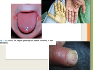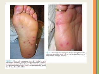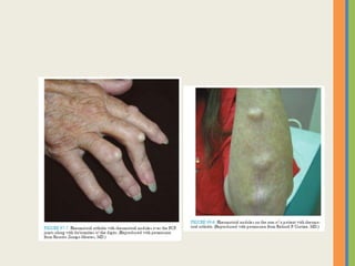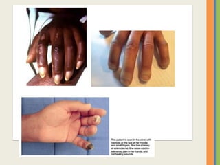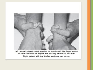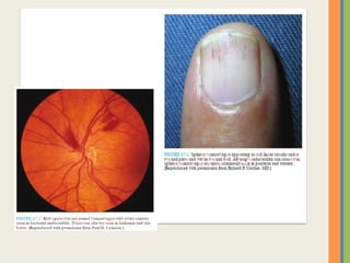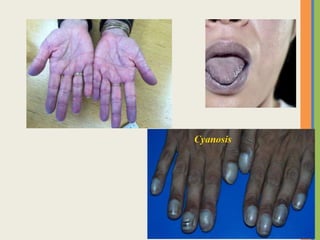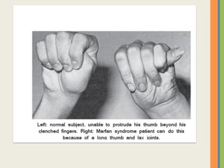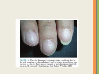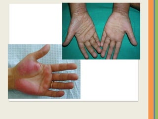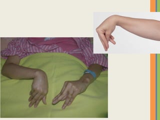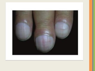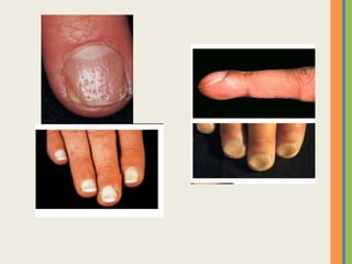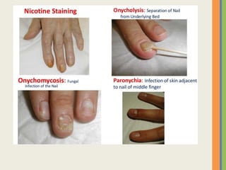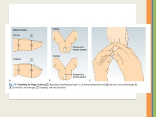 This document summarizes an examination of the upper limbs, including assessment of the pulse, skin temperature, anatomy, skin features, lymph nodes, and nail and hand shape. Specific conditions mentioned that could present findings on examination include Dubuytren's contracture, polydactyly, syndactyly, scleroderma, rheumatoid arthritis, osteoarthritis, psoriatic arthritis, gouty arthritis, and clubbing associated with thyroid disease or scleroderma.