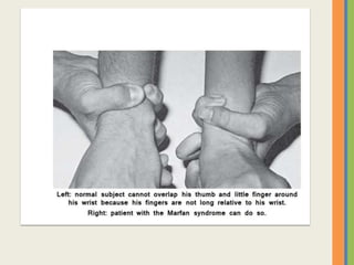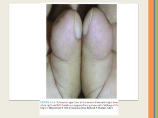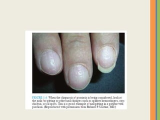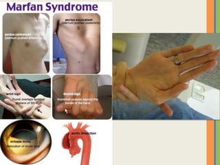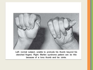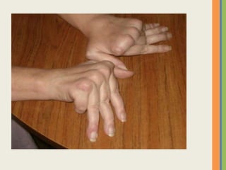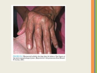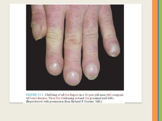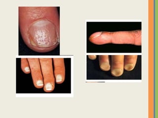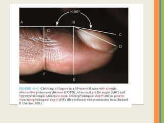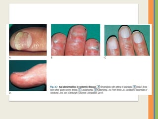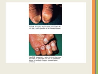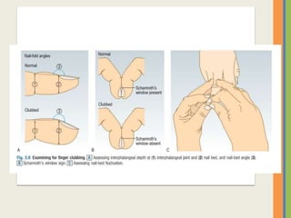 This document summarizes an examination of the upper limbs, including assessment of the pulse, skin temperature, anatomy, presence of any arteriovenous fistula, skin changes, lymph nodes, needle tracks, and nail changes. Specific conditions mentioned include Dubuytren's contracture, polydactyly, syndactyly, scleroderma, tetany, rheumatoid arthritis, osteoarthritis, psoriatic arthritis, gouty arthritis, and dactylitis. Clubbing of the nails and its causes are also discussed.