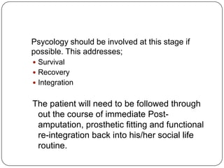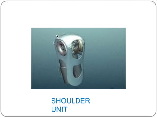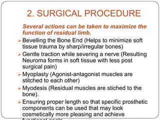 This document discusses upper limb prosthetics. It describes the characteristics of a successful prosthesis, considerations when choosing a prosthesis, reasons for upper limb amputations, amputation levels, types of prosthetics including cosmetic, functional, body-powered, externally powered and myoelectric prosthetics. It provides details on the typical components of an upper limb body-powered prosthesis including the socket, suspension, control cables, terminal devices and any intervening joint components. It outlines the timelines for amputation and prosthetic fitting.
