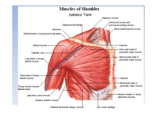 This document provides an overview of the muscles and topography of the upper and lower limbs. It begins with an outline listing the topics to be covered, including the muscles of the shoulder girdle, upper arm, forearm, hand, and fasciae of the upper limb. Similar structures of the lower limb are also listed. The document then describes the muscles of the upper limb in more detail, covering the muscles of the shoulder joint, upper arm, forearm, and hand. It also discusses the anatomy of relevant areas like the axillary cavity, cubital fossa, and topography of the forearm and hand. Synovial bursae of the upper limb are defined. In closing, clinical applications relating to