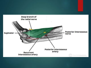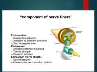 This document provides an overview of nerve anatomy and details on three major peripheral nerves - the radial nerve, median nerve, and ulnar nerve. It describes the origin, course, branches, and innervation of each nerve. The radial nerve originates from the brachial plexus and courses down the arm, branching to arm and forearm muscles before dividing in the forearm. The median nerve also originates from the brachial plexus, coursing through the arm and crossing the brachial artery to enter the forearm and hand. The ulnar nerve originates from the medial cord of the brachial plexus, traveling through the arm and elbow to enter the forearm, where it supplies forearm muscles