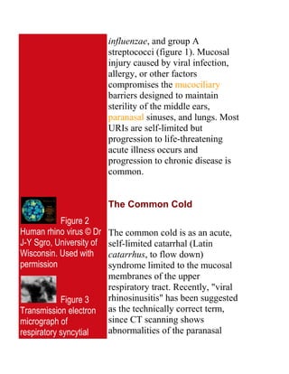1) Upper respiratory tract infections are very common and cause significant illness and costs. The nose, mouth and throat are exposed to viruses and normally harbor bacteria that can cause infection when barriers are compromised. 2) The common cold is usually self-limiting and caused by rhinoviruses, though other viruses can also cause cold symptoms. It is a major cause of illness. 3) Acute bacterial sinusitis occurs when viral infection blocks sinus drainage, allowing bacteria like streptococcus pneumoniae to infect the sinuses. Symptoms include nasal congestion and facial pain.