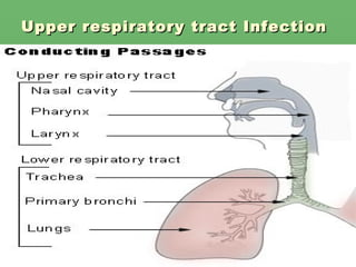 Upper respiratory tract infections are mostly caused by viruses, especially rhinoviruses, coronaviruses, adenoviruses, and influenza viruses. Bacteria can sometimes cause secondary infections. Common symptoms include cough, sore throat, nasal congestion, and sinus pain/pressure. Treatment focuses on relieving symptoms with medications like paracetamol and ibuprofen. Antibiotics are only used if bacteria are confirmed to be causing the infection. Complications can potentially involve the sinuses, ears, or in rare cases, more serious conditions.