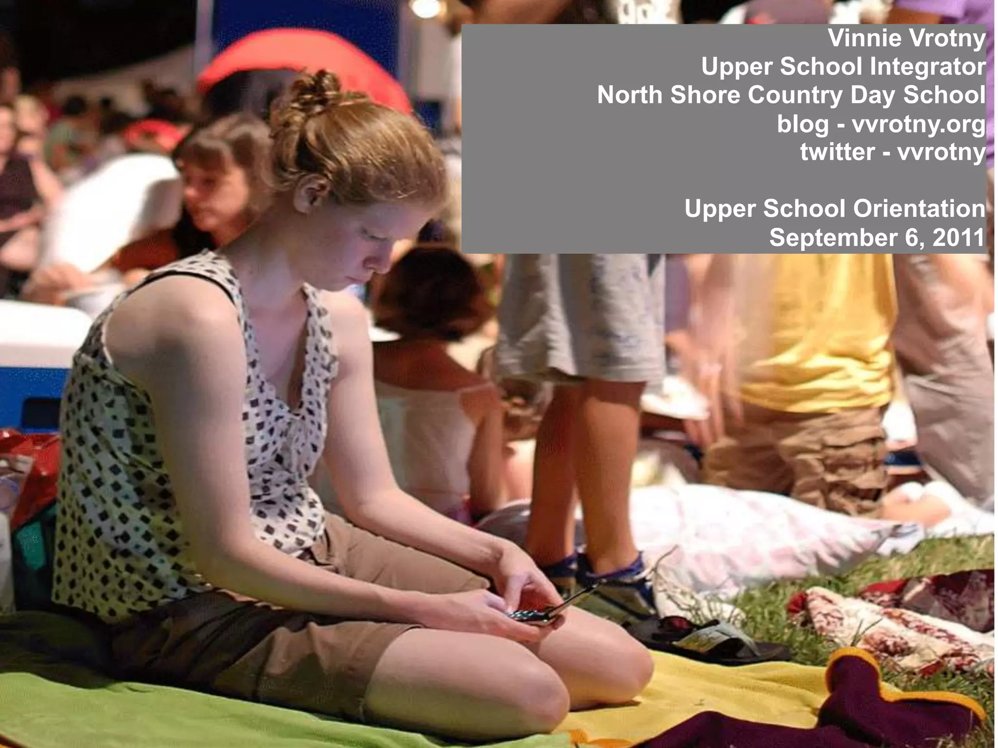 Vinnie Vrotny gave an orientation about upper school technology at North Shore Country Day School. He outlined that computers would be available for check out in study halls and classrooms. Four printers were accessible in various locations around campus with more to be added. The guest wireless network was being replaced by a single student network requiring usernames and passwords. Vinnie also discussed the school's technology acceptable use policy, prohibiting wasting bandwidth, sharing passwords, breaking laws, and disrespecting others. His goals for students were to learn how to filter information, build personal learning networks, communicate ideas using different tools, and make a positive impact.