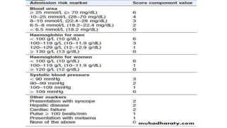 2. Symptoms include hematemesis (vomiting of blood) and melena (black tarry stools), and clinical assessment focuses on signs of blood loss severity. The Modified Blatchford Score stratifies bleeding risk.