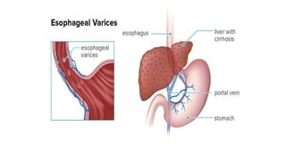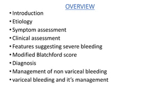 3. Initial management involves intravenous access, fluid resuscitation, gastric lavage, medications, and urgent endoscopy for diagnosis and treatment such as injection therapy or band ligation. Surgery or TIPSS procedure may be needed for