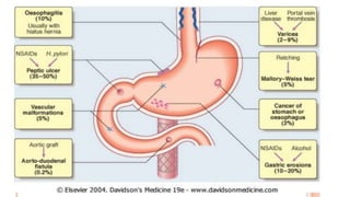 1. Upper gastrointestinal bleeding is a medical emergency caused by bleeding in the upper digestive tract proximal to the duodenojejunal junction. Common causes include esophageal varices, peptic ulcers, and Mallory-Weiss tears.
