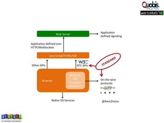 The document discusses updates on WebRTC standards as of July 2014, highlighting the technology's capabilities such as real-time voice, video, and data communication without requiring plugins. It outlines the challenges of signaling, codec selection, and interoperability with legacy VoIP systems, emphasizing that various proprietary signaling mechanisms are being implemented across different vendors. Future work is focused on finalizing WebRTC 1.0, improving aspects in WebRTC 2.0, and ensuring backward interoperability.