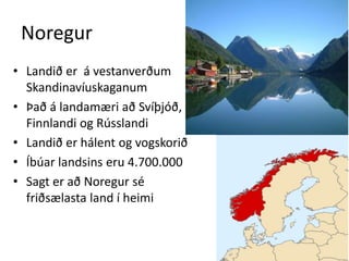 á vestanverðum SkandinavíuskaganumÞað á landamæri að Svíþjóð, Finnlandi og RússlandiLandið er hálent og vogskoriðÍbúar landsins eru 4.700.000Sagt er að Noregur sé friðsælasta land í heimi