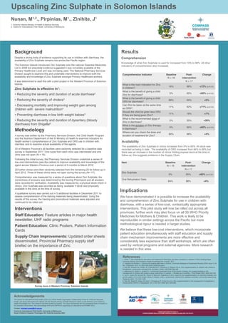 The document outlines a pilot project in the Solomon Islands aimed at increasing the availability and comprehension of zinc sulphate among primary healthcare workers to treat diarrhoea in children. It reports significant improvements in comprehension and availability of zinc due to low-cost interventions, with availability rising from 0% to 65% in clinics. The study highlights the effectiveness of integrating staff and patient education with supply chain improvements and indicates plans for broader implementation across provinces.