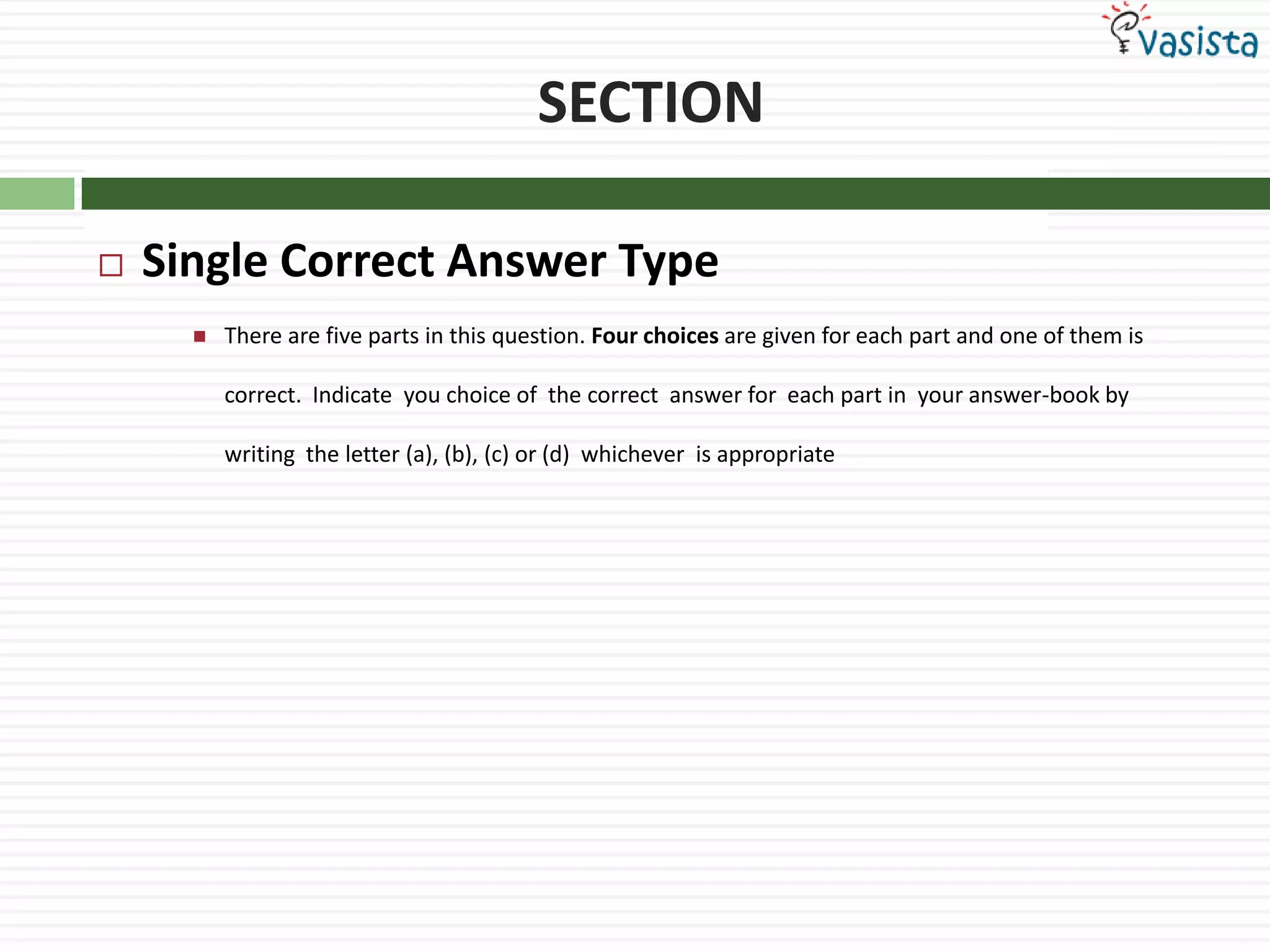 2. For each question, four possible answers (a, b, c, or d) are provided and test-takers must indicate the correct answer in their answer book.