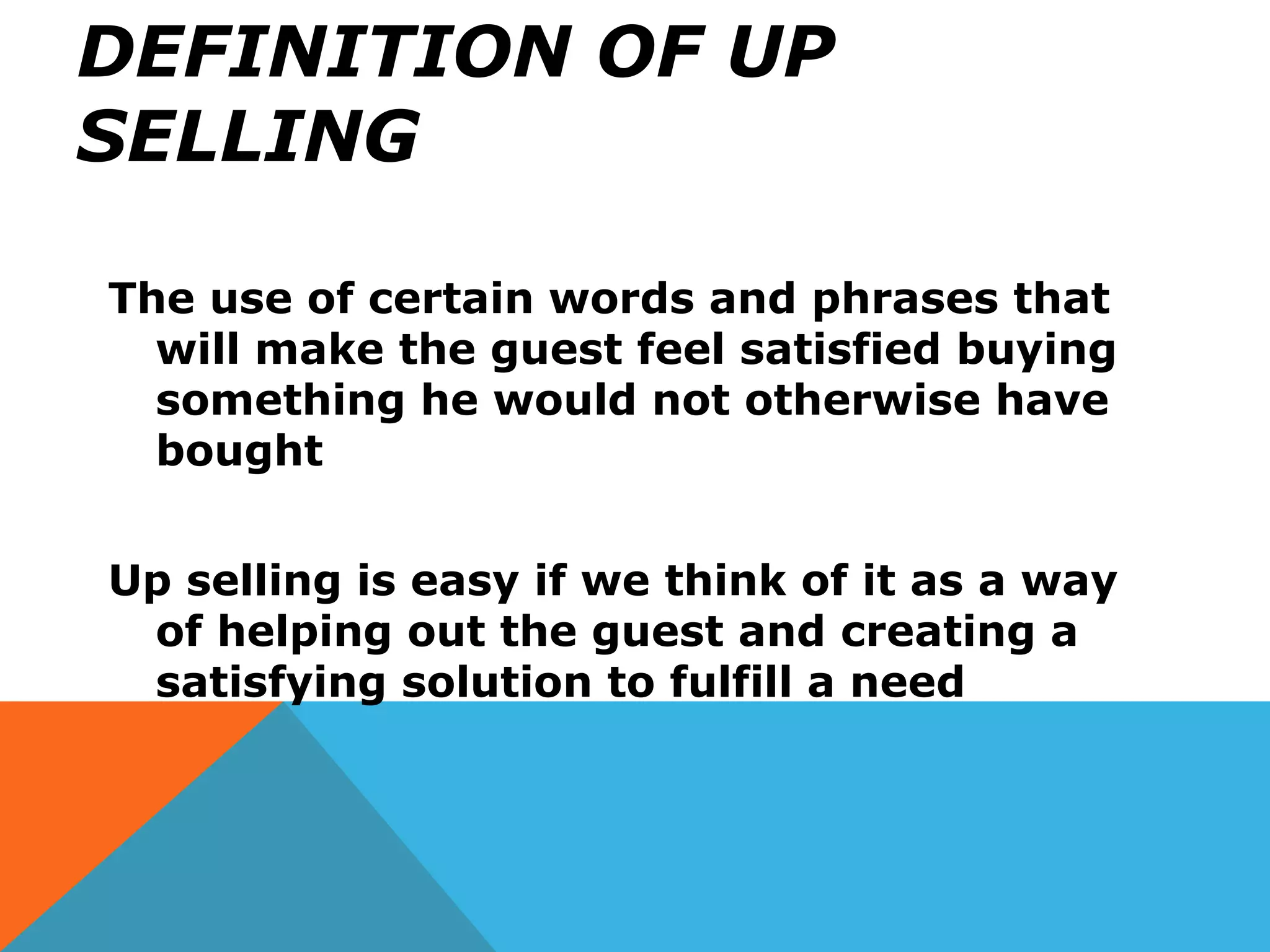 The document provides training on upselling techniques for hotel staff. It discusses identifying sales opportunities, building rapport with guests, matching guests' needs to products, and making recommendations confidently. While some guests may say "no" to suggestions, staff should not be scared of objections but handle them confidently by having answers prepared for why a suggestion was made. The goal of upselling is to increase guest satisfaction and hotel revenue, not to make guests uncomfortable.