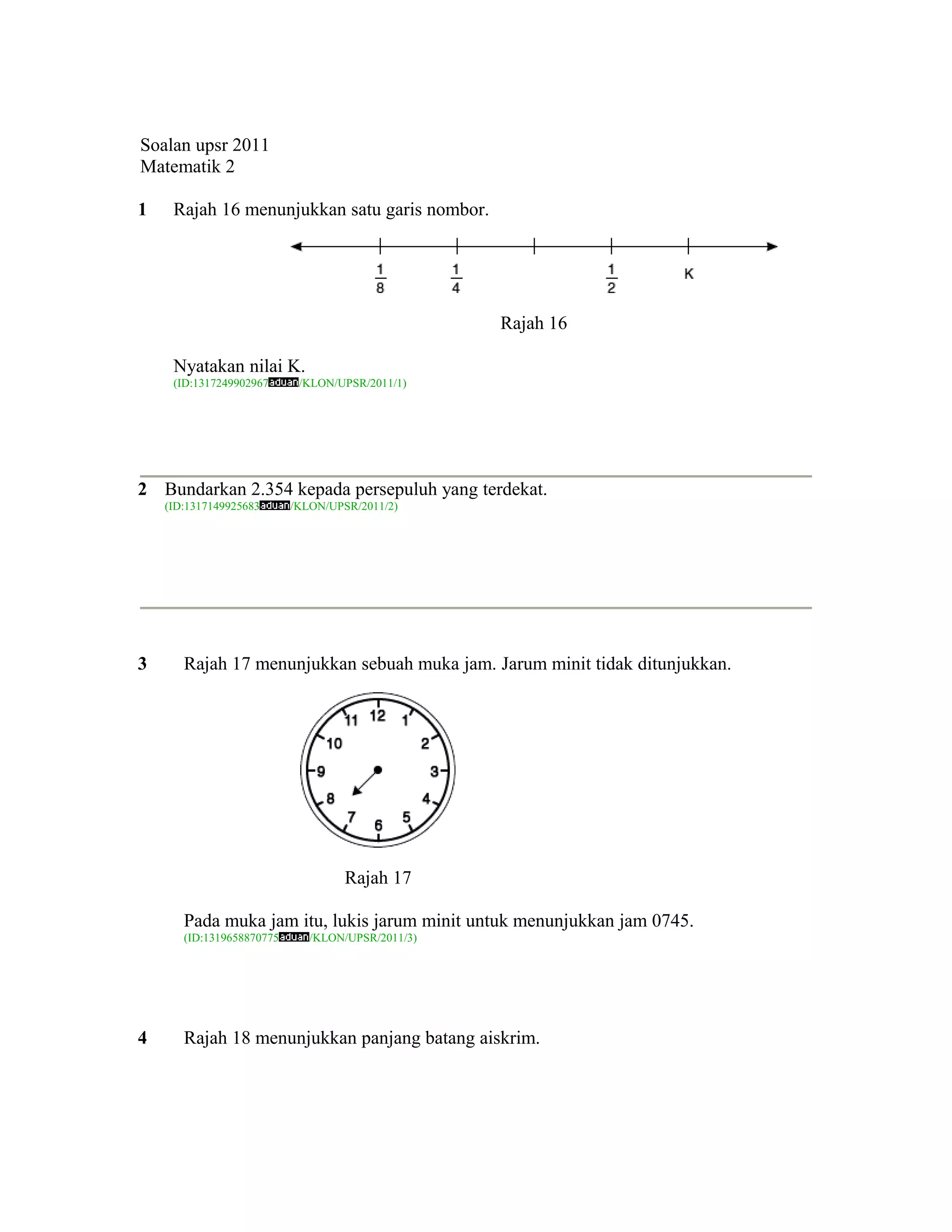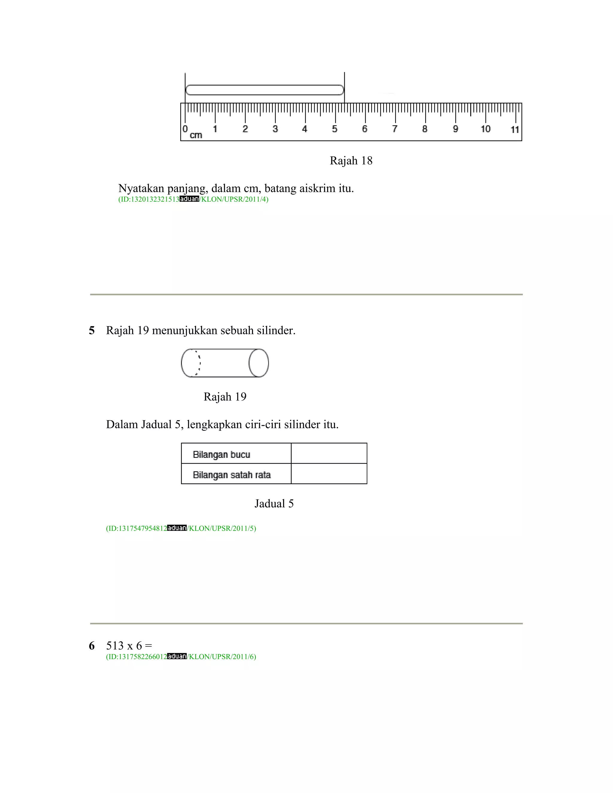 Dokumen ini merupakan soalan peperiksaan matematik UPSR 2011 yang meliputi pelbagai topik seperti pengiraan, ukuran, dan lukisan rajah. Ia termasuk soalan mengenai garis nombor, muka jam, ciri-ciri silinder, dan pelbagai pengiraan matematik lain. Setiap soalan dilengkapi dengan rujukan rajah dan ID yang berkaitan.