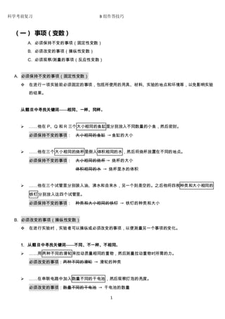 本文提供科学考前复习的作答技巧,包括固定性变数、操纵性变数和反应性变数的定义与例子;探讨实验目的、观察与推断的必要性,以及如何进行有效的预测和得出结论。重点强调在实验中必须注意的细节和常见错误,旨在帮助考生明确实验过程及其影响因素。