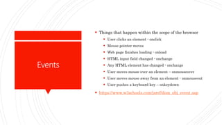 This document discusses JavaScript event handling. It lists common browser events like onclick, onmouseover, onkeydown. It explains that event handlers are JavaScript code that process events. It provides examples of defining event handlers inline in HTML and as separate functions. It also notes best practices like defining handlers as functions and using listeners for multiple handlers.