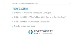 The document summarizes the agenda and topics discussed at the Upstate DevOps meetup on November 11, 2020. The meetup covered new developments in Dev and DevSecOps like HashiCorp Waypoint and Boundary projects, Kubernetes 1.19 enhancements, and VMware Tanzu. It also discussed trends around security shifting left, growth in cloud native projects and service meshes, increasing demand for DevOps skills, and the effectiveness of remote work.