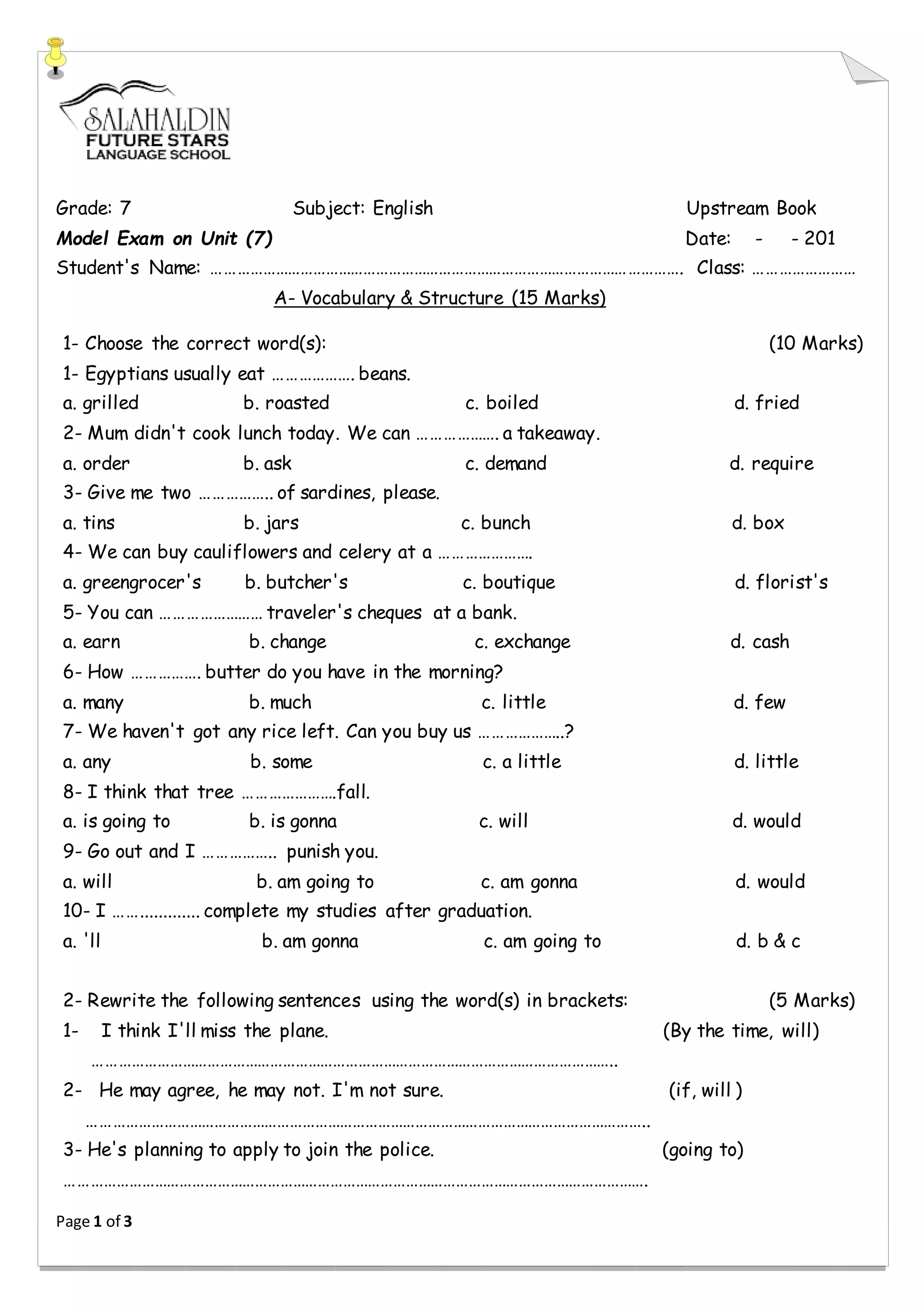 This document appears to be an English exam for 7th grade students consisting of multiple choice questions and short answer questions testing vocabulary, grammar, reading comprehension, and writing skills. The reading comprehension passage discusses the importance of trees in providing shade, shelter, oxygen, and medicines. It notes trees around homes can reduce heating and cooling costs and filter pollutants. The exam then has related multiple choice and short answer questions about the passage. The writing section asks students to write a letter describing shopping at a mall.