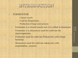 The document discusses fermentors and bioreactors. It describes how fermentors are closed vessels used for large-scale fermentation processes to produce products like antibiotics, amino acids, and organic acids. The document outlines the key components of fermentors, including a water jacket, stirring paddles, and inputs and outputs for nutrients, products, and steam. It also discusses upstream processing like medium preparation and sterilization, inoculation, and the different types of fermentation systems like batch, continuous, and fed-batch culture. Downstream processing steps like product extraction, purification, and formulation are also summarized.