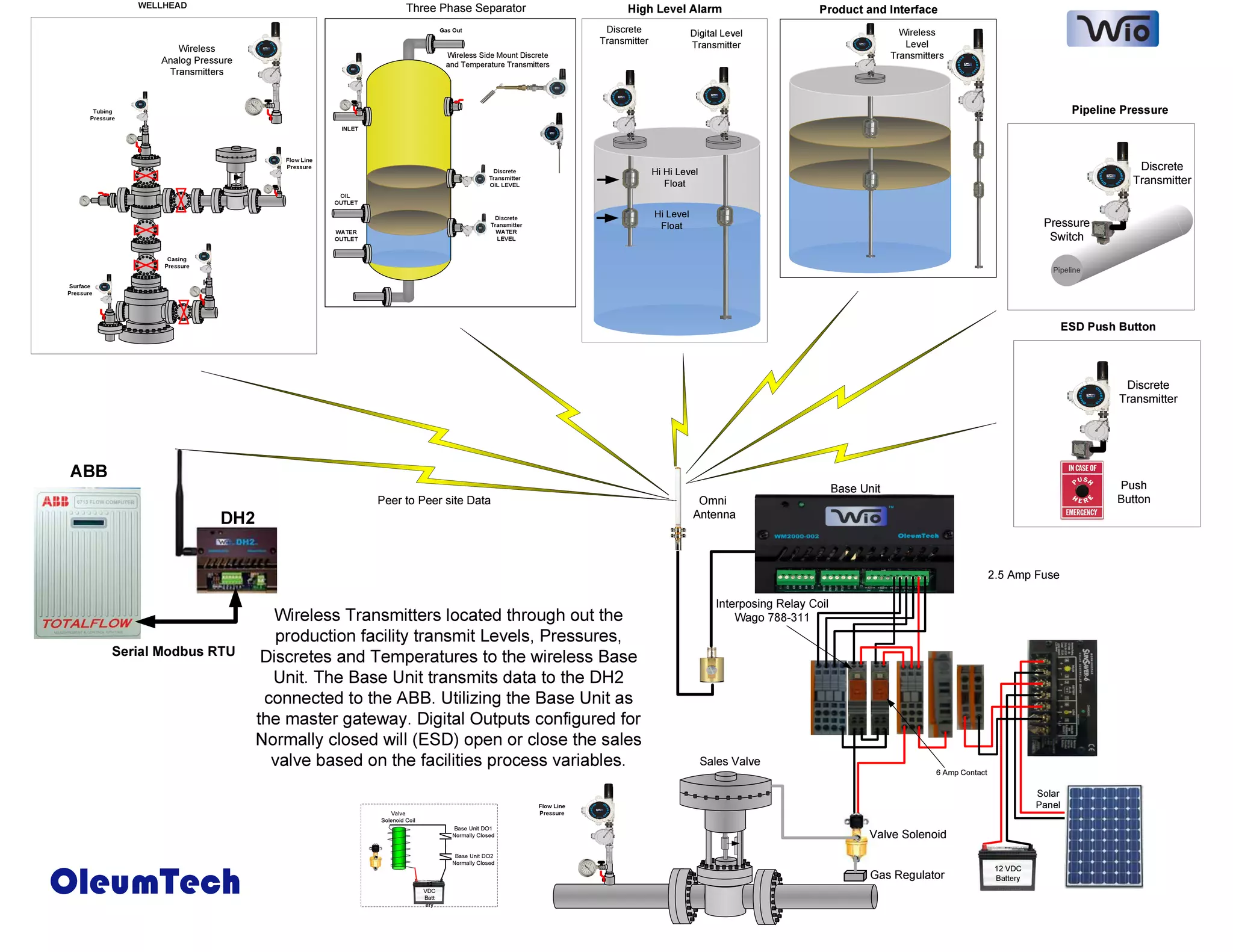 This document describes a wireless monitoring system for an oil and gas wellhead. Wireless transmitters located throughout the production facility transmit levels, pressures, discrete values and temperatures to a wireless base unit. The base unit then transmits this data via serial Modbus RTU to an ABB control system. Digital outputs from the base unit are configured to open or close a sales valve based on process variables, providing high and high-high level alarm protection for the separator.