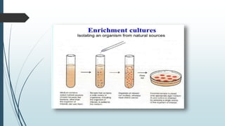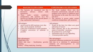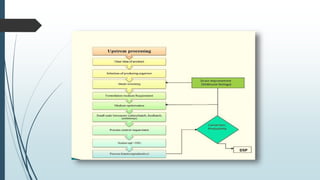The document summarizes key aspects of upstream processing in fermentation. The upstream process includes culture isolation and screening to obtain desired microorganisms, inoculum preparation using increasing media volumes to actively grow cultures, and media formulation and sterilization. Primary screening qualitatively determines which microorganisms can produce compounds of interest, while secondary screening characterizes industrially important organisms and determines yield potentials under different conditions to select microbes suitable for industrial use. Important steps in inoculum preparation and considerations for media composition like carbon, nitrogen, minerals and growth factors are also outlined.