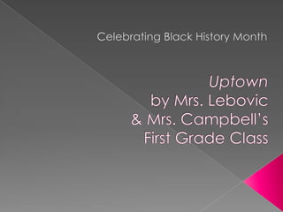 This document summarizes a class project about the book Uptown by Bryan Collier. The book gives a tour of Harlem through the eyes of a young boy and describes different aspects of life and culture in the neighborhood, such as chicken and waffles, brownstone buildings, shopping on 125th street, the Apollo Theater, jazz music, a barbershop, old photographs, basketball games, canvas awnings, little sisters in yellow dresses, sunset over the Hudson River, and a song by the Boys Choir of Harlem. The author Bryan Collier still lives in Harlem today and visits schools to talk about books and art.