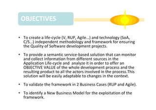 The document outlines the objectives and expected results of the U-Qasar project, aimed at creating a lifecycle-independent methodology for quality assurance in software development. It includes a platform for monitoring changes, assessing quality requirements, and proposing a new business model for the framework's exploitation. Collaboration opportunities with existing projects in cloud applications and semantic platforms are highlighted, alongside an invitation for ongoing projects to validate the U-Qasar platform.