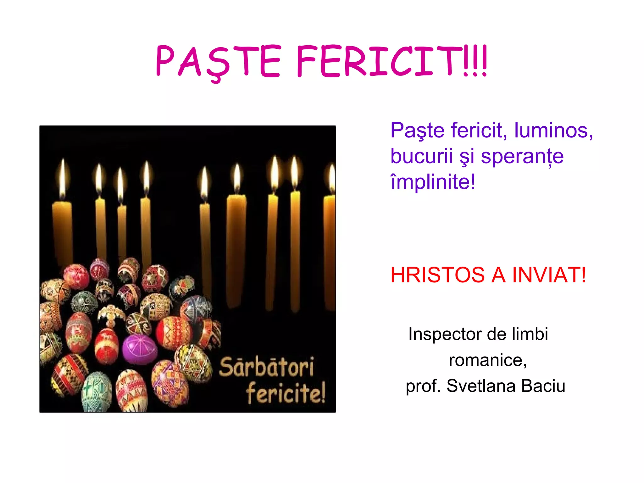 Documentul transmite urări de Paște fericit, luminos, plin de bucurii și speranțe împlinite. Se face referire la tradiții religioase prin expresia 'Hristos a înviat'. Autorul este inspector de limbi romanice, prof. Svetlana Baciu.