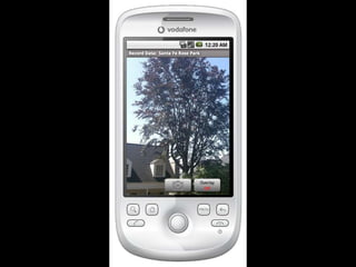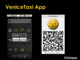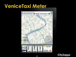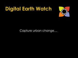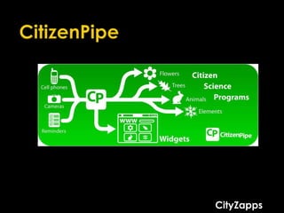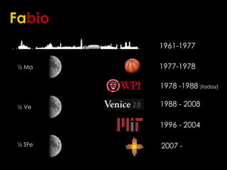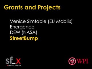 This document summarizes Fabio Carrera's research interests and projects related to developing an "Ambient Urban Platform" using autonomous agents and citizen apps for interactive urban planning. Some of the key projects discussed are the Venice Project Center, City Knowledge/City Lab, Santa Fe Project Center, Digital Earth Watch (DEW) project with NASA, and StreetBUMP project with the City of Boston. The goal is to develop a platform that integrates crowdsourcing data from mobile apps, sensors, and citizens to model and visualize urban systems and enable participatory decision-making.