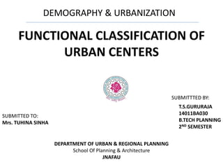 The document discusses the functional classification of Indian cities as proposed by Asok Mitra. He grouped cities into seven categories - manufacturing, artisan, mining, plantation, trading, transport and services - based on the percentage of workers engaged in different economic sectors. Mitra further classified the cities based on their degree of specialization using a triangular method to plot each city on a graph. While the classification identified specialized city types, most Indian cities were found to have a diversified economic base with no clear single function.