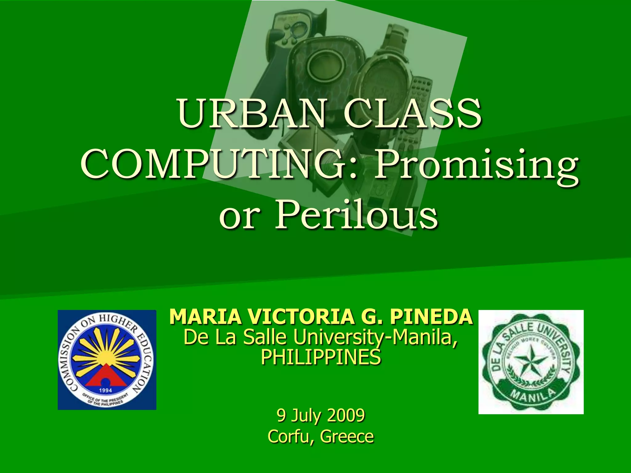 The document discusses urban class computing (UCC) as an integration of technology in urban university settings, specifically at De La Salle University in the Philippines. It presents various student demographics, web usage statistics, and the significance of ICT tools in learning and social interactions. Additionally, it highlights challenges in adapting to technology infrastructure and emphasizes the need for collaboration with private companies to maintain quality ICT services.