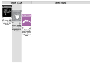 The document discusses urban design projects focused on sustainable redevelopment of Los Angeles. It first summarizes research projects from UCLA in 2015-2016 looking at hierarchy, scale, and systems in urban design. It then details a project analyzing water and energy systems in LA County and redesigning Wilshire Boulevard to accommodate 1 million additional residents by 2050 through transit-oriented development. This would achieve 100% locally-sourced water and renewable energy through densification along Wilshire while preserving other areas. Maps and analyses compare current and projected water use, energy use, density, and open space along Wilshire neighborhoods. The goal is to limit urban sprawl through focused redevelopment.