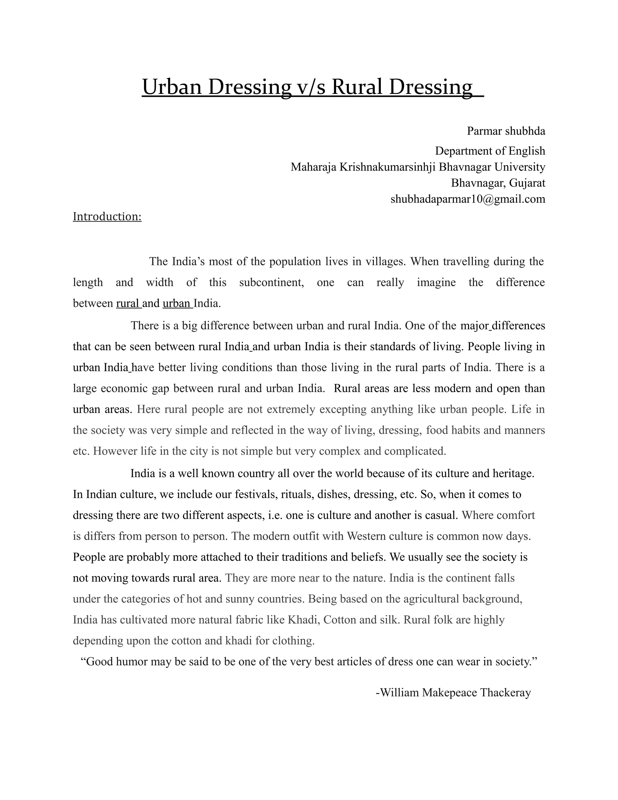 There are significant differences between urban and rural dressing styles in India. In rural areas, traditional fabrics like cotton and khadi are most common, and styles typically reflect local cultural traditions. Men often wear lungis and kurtas, while women commonly wear saris. Urban dressing is more influenced by Western fashion trends and prioritizes comfort, with clothing choices also reflecting one's profession. While rural communities emphasize tradition and family bonds, urban living is more individualistic and flexible. However, urban and rural styles are increasingly blending as cultures globalize and people move between areas.