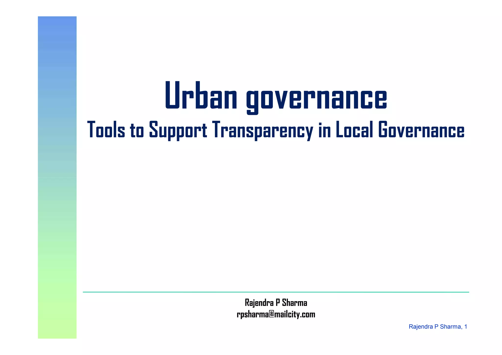 This document discusses tools to support transparency in local urban governance. It notes the global trend of urbanization and challenges of increasing poverty, unsustainable development patterns, and limited local government capacity. New approaches emphasize good governance, local authorities as enablers, partnerships, and inclusiveness. Promising innovations need scaling up. Key ingredients for inclusive cities are good urban governance and tools that support principles like sustainability, equity and civic engagement. These include participatory budgeting, decision making, and local dialogues. Expected outcomes are more equitable services, accountability, legitimacy, and resources.