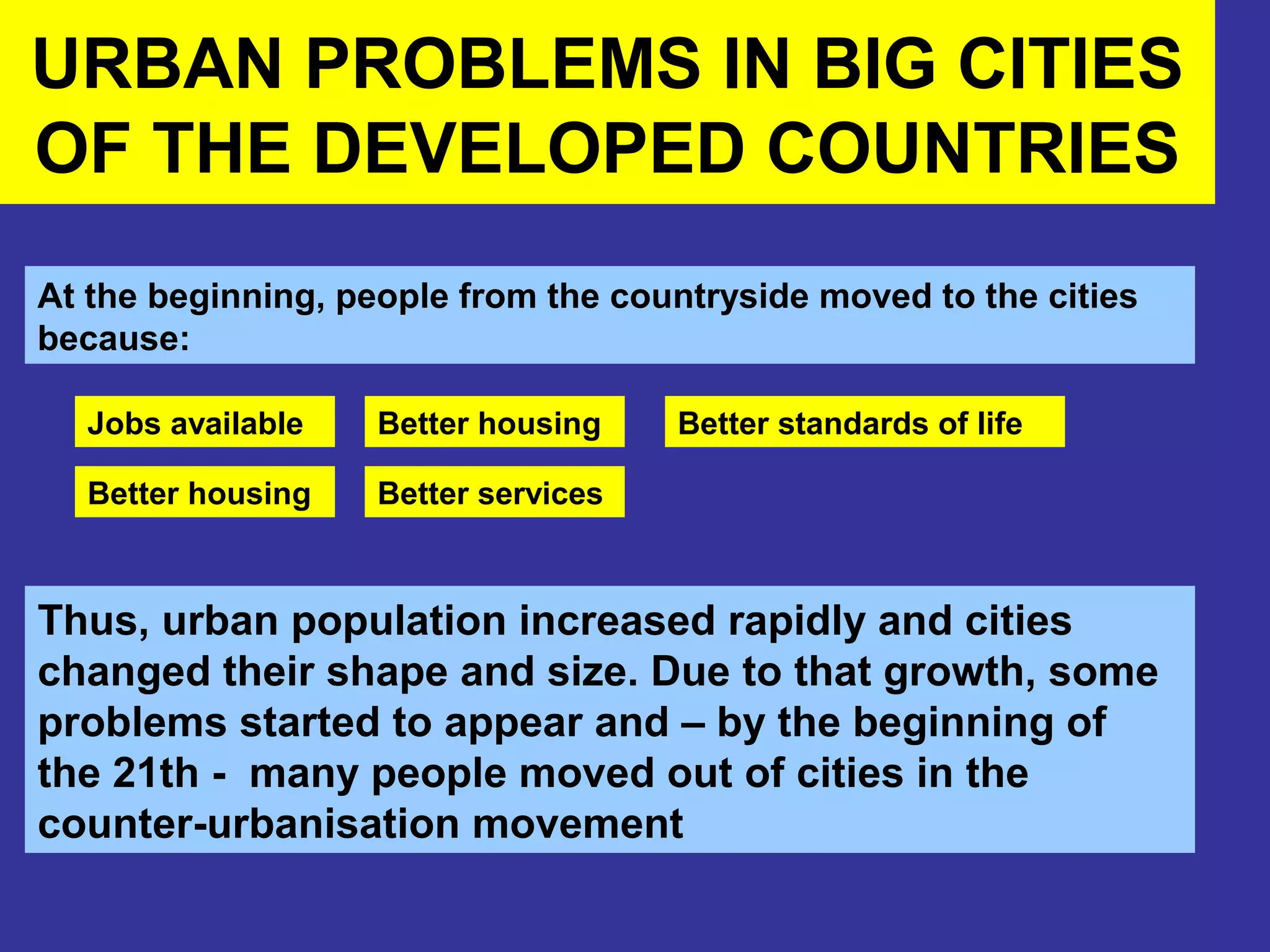 This document discusses urban problems in large cities of developed countries. As people moved from rural areas to cities for jobs and improved standards of living, urban populations rapidly increased. This growth led to issues like crime, homelessness, traffic congestion, high housing costs, and environmental pollution in city centers. Outer suburbs faced problems like expensive commuting and crime. Inner cities struggled with racial tensions, unemployment as factories closed, poor housing, and a lack of amenities and services. The rural-urban fringe also saw crime and expensive housing. These economic, social, environmental, and housing stresses created cycles of poverty that governments and communities worked to overcome.