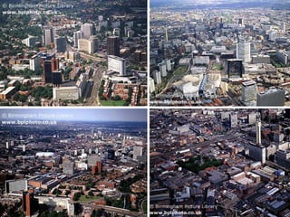 The document discusses Burgess's concentric zone model of urban land use. It provides context on Birmingham as a case study city, describing the central business district and different urban zones. It also discusses urban renewal compared to comprehensive redevelopment, noting urban renewal allows existing communities to stay in improved areas.