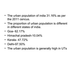 Urban settlements are characterized by high population densities, populations engaged mostly in non-agricultural sectors, and nucleated settlements with distinct economic and cultural characteristics compared to rural areas. India's urban population was 31.16% in 2011, with large variation between states from 62.17% in Goa to 10.04% in Himachal Pradesh. Urban areas are officially defined as settlements with over 5,000 people, density over 400/sq km, and at least 75% engaged in non-farm work. Urban centers are further classified based on population as towns (<100k), cities (100k-1m), metropolises (>1m), and megacities (>5m people). Problems faced