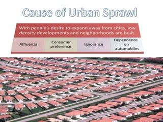 This document discusses some of the negative impacts of urban sprawl such as increased cost of living, resource consumption, water pollution from agriculture and waste, and air pollution from reliance on automobiles and industry. It notes that pollution can come from point sources like factories or non-point sources like runoff. Urban sprawl is also linked to health issues like respiratory illnesses that disproportionately impact the elderly and young. Some proposed solutions include promoting smart growth to reduce car dependency, creating sustainable cities that allow walking and transit, and educating communities to encourage sustainable development.