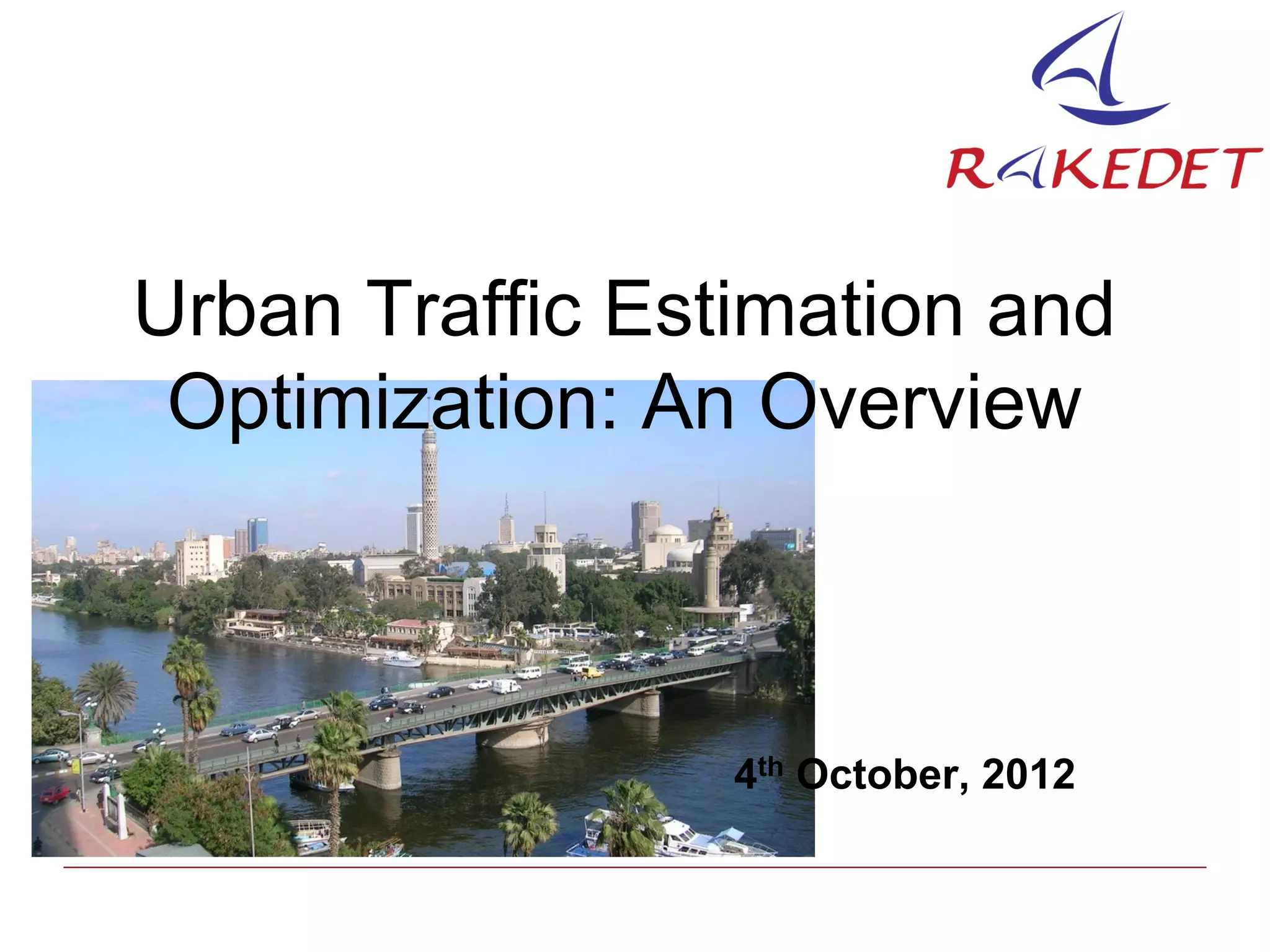 This document discusses several methods for urban traffic estimation and optimization. It describes two categories of traffic estimation - queue length and travel time estimation. Methods mentioned include using mobile phones, GPS data from mobile phones, and vehicle-to-vehicle communication. The document also discusses optimizing traffic through vehicle routing and traffic signal control, and references models for traffic optimization, signal control, and dynamic vehicle routing based on real-time traffic information.