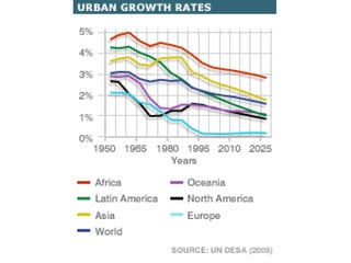 UN estimates suggest that two-thirds of the world's population will live in cities within 50 years. This document discusses urbanization and the urbanization cycle. It asks the reader to make notes on urbanization and the urbanization cycle, and describe and comment on the patterns shown in slides 4 and 6.