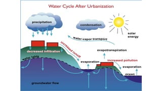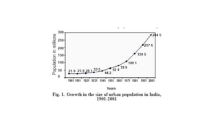 Urbanization has significant environmental impacts. It causes increased pollution in the form of greenhouse gases from fossil fuel combustion, acid rain from sulfur dioxide emissions, and degraded water quality from sewage. It also creates urban heat islands and modifies habitats. As more land is converted to urban uses, habitats are destroyed or fragmented and species are forced to adapt. Rapid urban growth in India is exacerbating these environmental problems as millions migrate to cities annually, and the urban population is expected to reach 74% of the total by 2025, placing huge demands on infrastructure and resources.