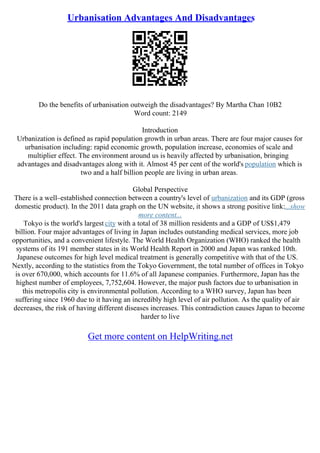 Urbanization refers to the rapid growth of populations in urban areas, with predictions stating that by 2050, a significant percentage of both developing and developed worlds will be urbanized. Although urbanization brings benefits such as job opportunities and improved medical services, it also results in serious challenges including pollution, public health risks, and strained social services. The document discusses these impacts, emphasizing the necessity for sustainable development policies to mitigate the negative consequences associated with urban growth.