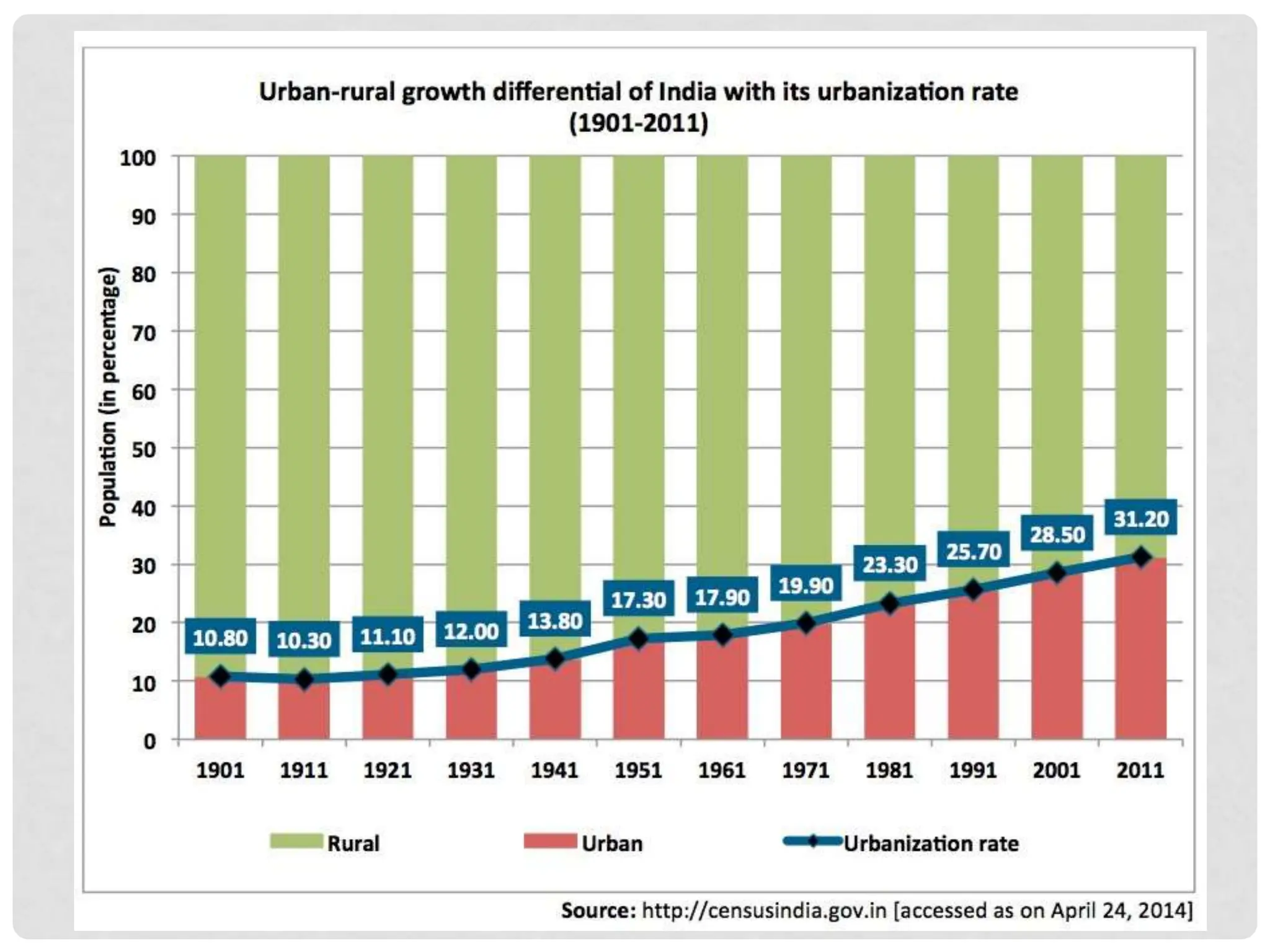 The document defines urban areas, detailing criteria for classification, including population size and employment types. It provides statistical data on urban agglomerations, towns, migration patterns, and demographic trends in India from 2001 to 2011, alongside global urbanization insights. The urbanization process is influenced by rural-urban migration, natural population growth, and the reclassification of areas, highlighting the socio-economic factors affecting population distribution.