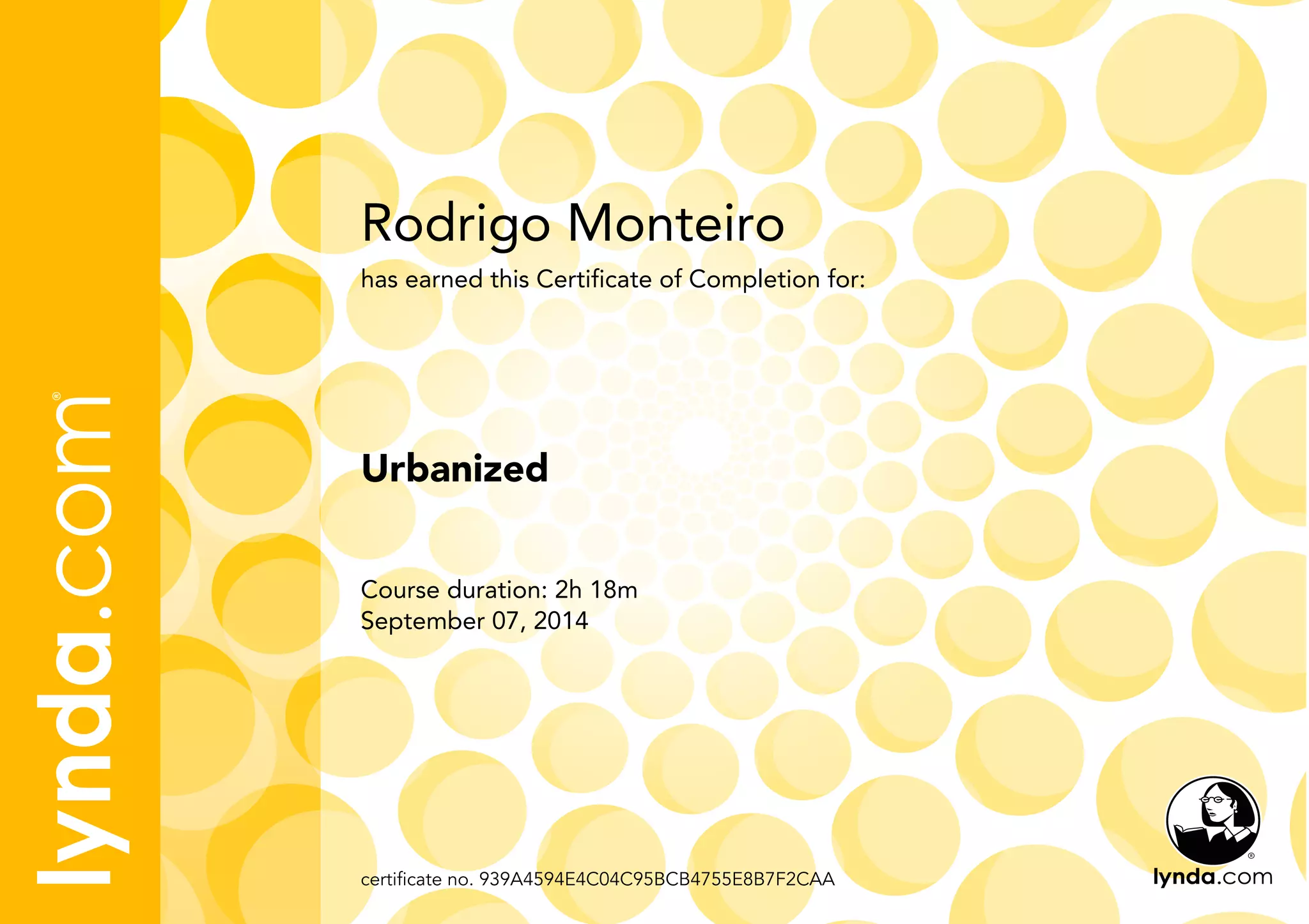 Rodrigo Monteiro earned a Certificate of Completion for the Urbanized course that lasted 2 hours and 18 minutes and was completed on September 07, 2014 with certificate number 939A4594E4C04C95BCB4755E8B7F2CAA.