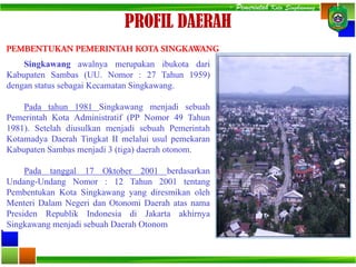 Dokumen ini membahas perkembangan dan rencana pembangunan Kota Singkawang dari tahun 2013 hingga 2017, termasuk aspek geografi, demografi, dan sektor-sektor unggulan seperti pariwisata dan air bersih. Kota Singkawang, yang memiliki luas wilayah 504 km², dibagi menjadi lima kecamatan dan dikenal dengan potensi wisata alam dan budaya. Rencana pembangunan juga mencakup pengembangan infrastruktur, seperti bandar udara dan pasar tradisional, untuk mendukung ekonomi lokal.