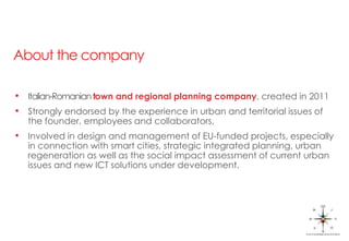 Urbsofia is an Italian-Romanian company founded in 2011, specializing in urban and territorial planning, with a focus on EU-funded projects related to smart cities and urban regeneration. The company aims to provide integrated, participatory solutions to urban challenges through high-level research and expertise in policy design and strategic development. Their services include project management, urban planning, social innovation, and impact assessments.